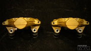 Finished in gold paint with laser logos. Sold as a pair of left and right calipers with pads and hardware included. We chose to include brake pads that lock up hard when brakes are cold, which is perfect for handbrake use in drifting.